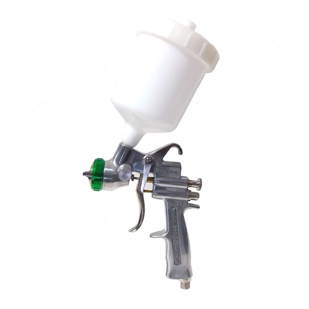 Пневматический краскопульт 6011 HVLP относится к новой линейке распылителей, которые отличает долгий срок службы, высокое качество работы, отличная производительность. В основе работы этого краскопульта лежит технология HVLP– "большой объем, низкое давление". Благодаря особому строению воздуховодов происходит резкое падение давления: с 2,5-3 атм. на входе до 0,7 атм. на выходе. Технология HVLP позволяет достичь низкого туманообразования (и, следовательно, меньшего загрязнения окружающего воздуха), высокой скорости работы и качества окраски. Краскопульт 6011 HVLP – универсальный инструмент для широкого спектра задач: окраска мебели, кузовной ремонт, промышленная окраска, отделочные и декоративные работы. Данный распылитель удобен в эксплуатации, прост в обслуживании, имеет эргономичную конструкцию. Устойчив к воздействию агрессивных химических веществ благодаря отсутствию уплотнительных прокладок в распыляющая головке. Корпус выполнен из никелированного алюминия – прочного, невосприимчивого к коррозии сплава. Игла – из нержавеющей стали.Масса краскопульта – 755 г. Рекомендуемое давление – 2,5-3 бар. Расход воздуха – 220 л/мин. Верхний нейлоновый бачок объемом 680 мл. Диаметр сопла - 2,5 мм.Низкое воздухопотребление.Экологичность.Универсальность.